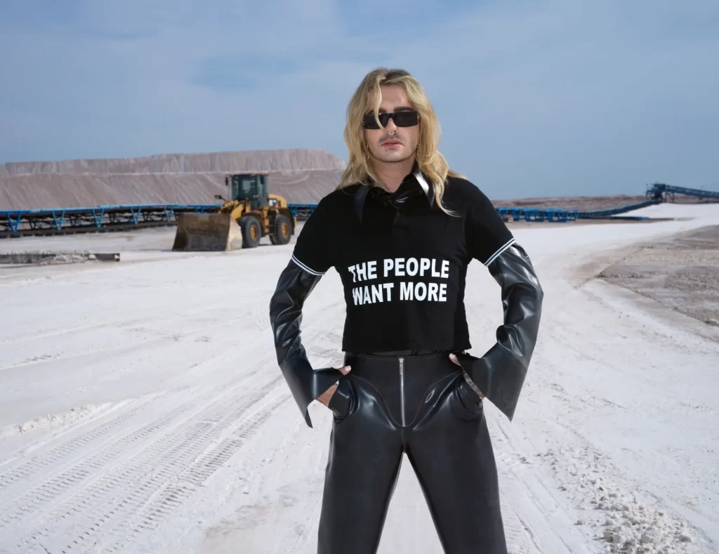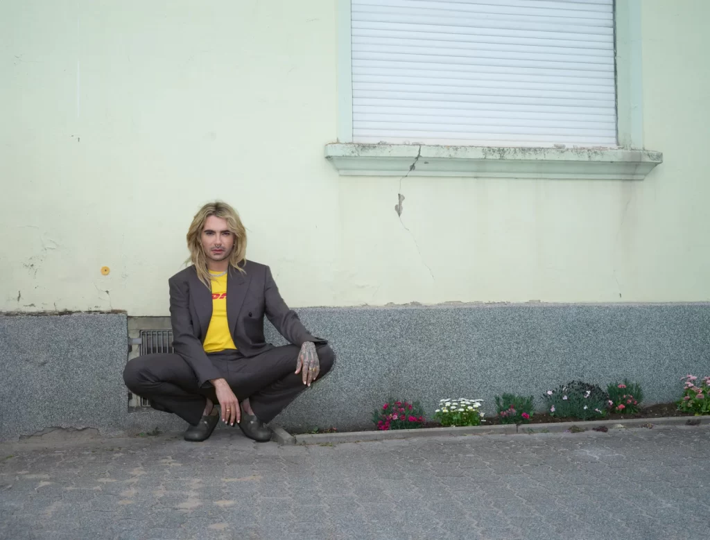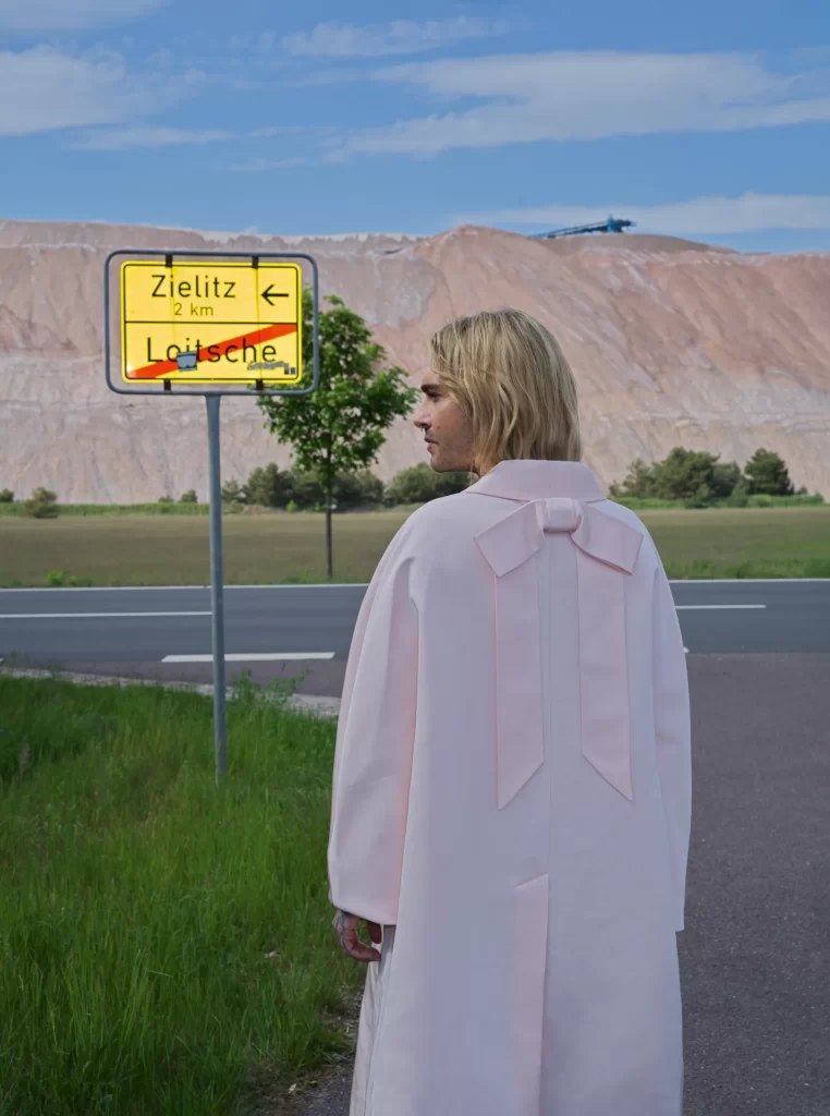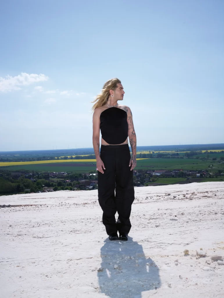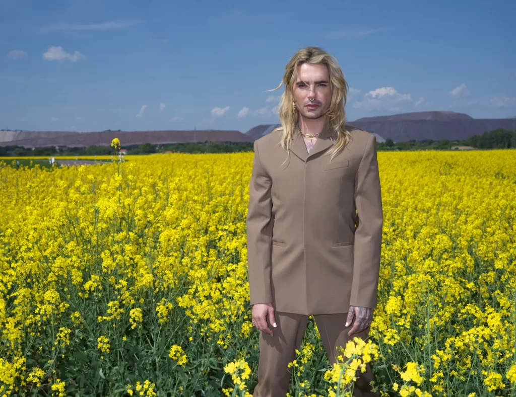 Bill Kaulitz em um campo de colza, com o “Kilimanjaro” de Zielitz ao fundo, onde cresceu: paletó com abertura oculta para botões e calças de terno combinando, ambos da 032C. Corrente de elos e brincos de ouro amarelo, ambos da TIFFANY & CO. Piercings no septo e no lábio, em particular. Foto: Frederike Helwig. Styling: Niki Pauls. Cabelo: Patrick Gorra. Maquiagem: Natalie Franz. Assistentes de fotografia: Anna Sophie John, Chris Michele. Assistente de moda: Stella Raschke. Produtora executiva: Ronja Prinz/Studio 11:40. Produtora sênior: Pia Domkowski. Assistente de produção: Claire Hannon. Gerente de set: Sidney Lubwa. Editor visual: Andrea Vollmer-Hess. Diretor de elenco: Dominik Wimmer. Chefe de conteúdo editorial: Kerstin Weng. Agradecimentos sinceros ao Dorint Herrenkrug Parkhotel Magdeburg e ao Kaliwerk Zielitz.